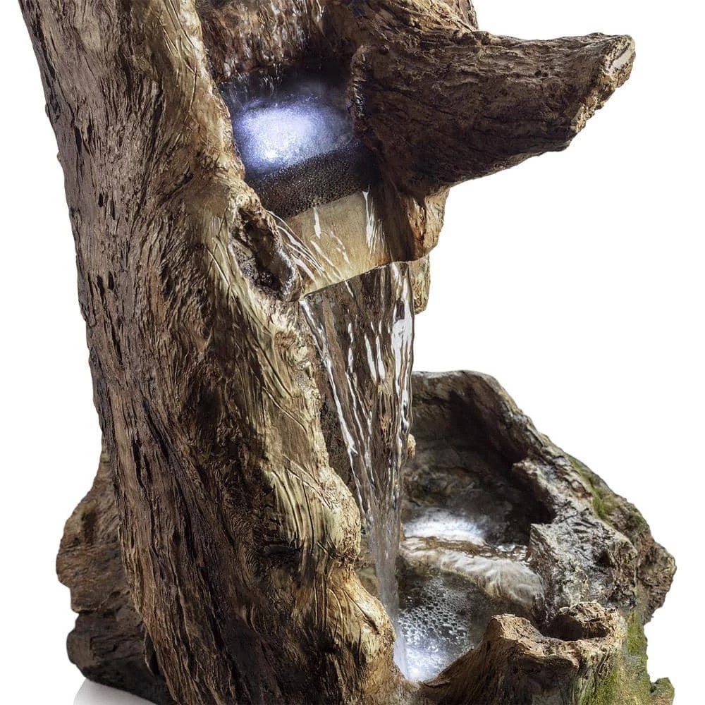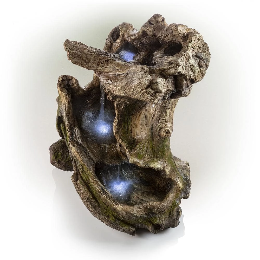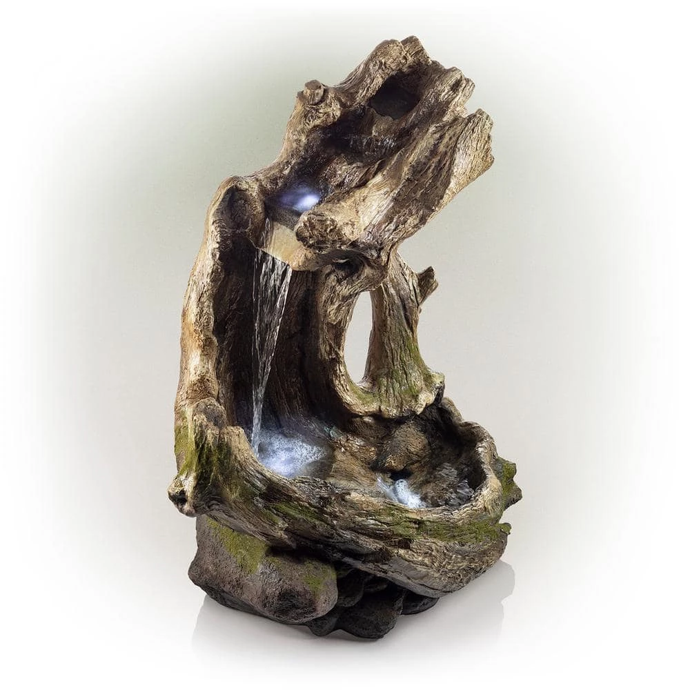 Relax and enjoy the sounds of nature with the Alpine Corporation Rainforest Curved Log Fountain. This outdoor fountain looks great in your garden, patio, deck, porch, or yard space. The curved trunk opens up to reveal a gentle cascade of water that emits a calming, relaxing sound you’ll love at the end of the day. Completely natural in appearance right down to the green moss growing on the trunk and stone base, the fountain is actually crafted of durable, weather-resistant fiberglass, resin, and stone powder. LED lights in the lower tier illuminate your space, drawing attention to the relaxing water pool day or night for added ambiance. To use, simply plug in the power cord to an outdoor outlet, fill the lower level with water, and watch as the interior pump creates a lovely water flow reminiscent of a lush rainforest. With a 1-year warranty, you can be confident in the quality of your purchase. Fountain measures 30 in. L x 20 in. W x 41 in. H for use in yards of any size.