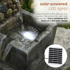 - Solar-powered LED lights: solar-powered LEDs light up your garden throughout the night and the fountain runs a minimum of 5-hours on a full solar charge