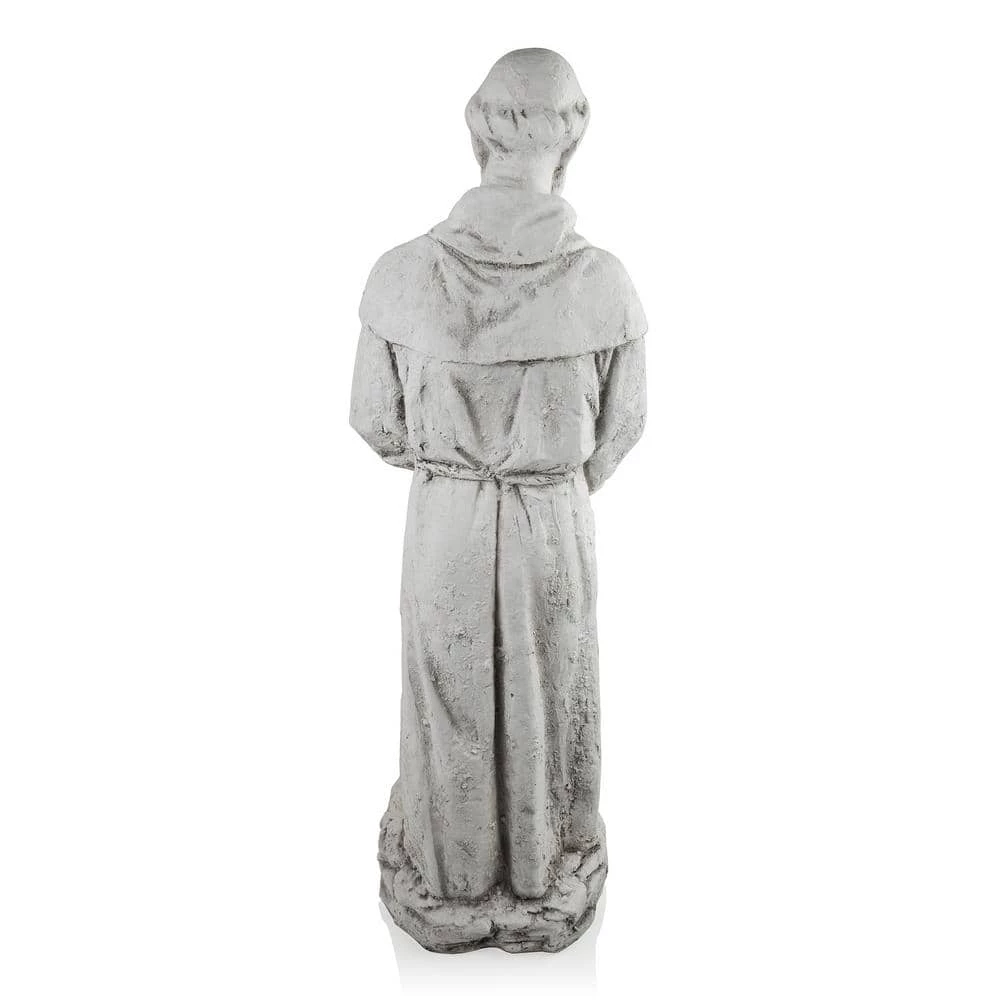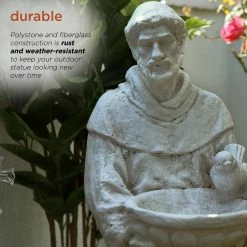Add a touch of serenity to your outdoor space with the Alpine Corporation Saint Francis Birdbath. This stunning and peaceful sculpture is constructed with durable polystone with fiberglass materials but finished to look like stone. The statue is weather-proof, rust-resistant, and durable for years of quality use. With its antique-look, intricate details and portrayal of Saint Francis, this Alpine birdbath is sure to bring peace and tranquility to your home. Birds will love bathing in the shallow bowl. This statue can also be used as a bird feeder. The statue is perfect for your garden, patio, deck, porch, or yard space. Looks great indoors, too. With a 1-year warranty, you can be confident in the quality of your purchase. Statue measures 14 in. L x 18 in. W x 45 in. H for use in yards of any size.Alpine Corporation is one of America’s leading designers, importers, and distributors of superior quality home and garden Decor products. Alpine’s award winning in-house design team continuously develops new and innovative “statement pieces” for your home and garden. Your outdoor living spaces will be the envy of the neighborhood with our wide assortment of fresh, fashionable and contemporary products, from beautifully crafted solar garden stakes featuring patented motion and fiber optic lighting technology to gorgeous glass and glow-in-the-dark birdbaths and feeders.