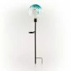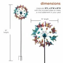 Add a stylish accent to your outdoor space with the Alpine Corporation Solar Butterfly Wind Spinner Stake. This decorative wind spinner features rainbow-colored butterfly blades surrounding a color-changing LED light in a glass crackle ball to offer stunning movement and motion. The integrated color-changing LED light gradually changes to display beautiful jewel tone hues of green, purple, blue, red and magenta. The spinner provides a dazzling colorful display during the day that becomes more captivating in the evening as the LED light illuminates the butterflies. This free-standing spinner can be placed on its own or paired with multiple spinners along your patio, porch, driveway, or pathway to create a mesmerizing outdoor display. The durable metal spinner and stake construction is designed for long-lasting and all-season outdoor use, and it is easy to clean to maintain its reflective shine and vibrant colors. Simply plant the stake into the ground for quick and easy set up and use the on/off switch for convenient operation. At over 5 ft. tall, this windmill spinner measures 15 in. L x 9 in. W x 61 in. H with the included stake to make a vivid statement in your yard, and includes a 1-year manufacturer’s warranty from date of purchase.