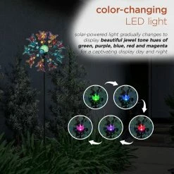 - Color-changing LED light: solar-powered light gradually changes to display beautiful jewel tone hues of green, purple, blue, red and magenta for a captivating display day and night