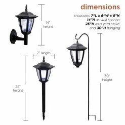 - Outdoor yard decor and 1-year warranty: measures 7 in. L x 6 in. W x 8 in. H, 14 in. As a wall sconce, 25 in. As a yard stake and 30 in. Hanging, and includes a 1-year manufacturer’s warranty from date of purchase