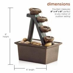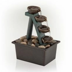 Unplug from the day and relax to the soothing sound of flowing water with Alpine Corporation’s 8 in. tall Indoor/Outdoor 4-Tier Step Tabletop Fountain with Rustic Bowls. This modern Zen-style tabletop fountain statue provides a tranquil addition to your living room, office, outdoor Decor or wherever you desire a touch of calming flair. Constructed from durable polyresin and plastic, the fountain is weatherproof, rust-resistant, and resilient and can be used in your home’s interior Decor or outside. Evoking a meditative Zen atmosphere, the fountain has a natural aged appearance with 4 tiers of rustic bowls. Relax to the sounds of the relaxing natural water flow as it trickles down from tier to tier. For quick install and convenient operating, the tabletop fountain includes all necessary parts and a pump, to begin creating a soothing oasis. This fountain measures a convenient 6 in. L x 4 in. W x 8 in. H to fit almost any indoor or outdoor table space and includes a 1-year manufacturer’s warranty from date of purchase.
