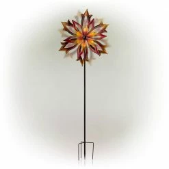 Welcome your guests with the 96 in.” tall Outdoor Metal Flower Dual Kinetic Spinner Stake Yard Decoration from Alpine Corporation. This multicolored outdoor yard art is made with a double-sided red, yellow and brown flower design and adds a breathtaking display of spinning movement and motion with dual spinning action. Skillfully crafted from weather-resistant and sturdy iron and glass, the all-season decorative spinner can be cleaned easily to keep its reflective shine and rustic appearance. Add one or multiple spinners to enhance your garden’s natural beauty with their farmhouse design and eye-catching movements. Add an attractive outdoor display by lining several spinners along your driveway or front walkway or in your garden. All parts are included for a quick install and convenient outdoor decorating. The outdoor spinner includes an attached ground stake to secure along pathways or in your flowerbeds. This kinetic wind spinner measures 37 in. L x 11 in. W x 96 in. H with included ground stake, and includes a 1-year manufacturer’s warranty from date of purchase.