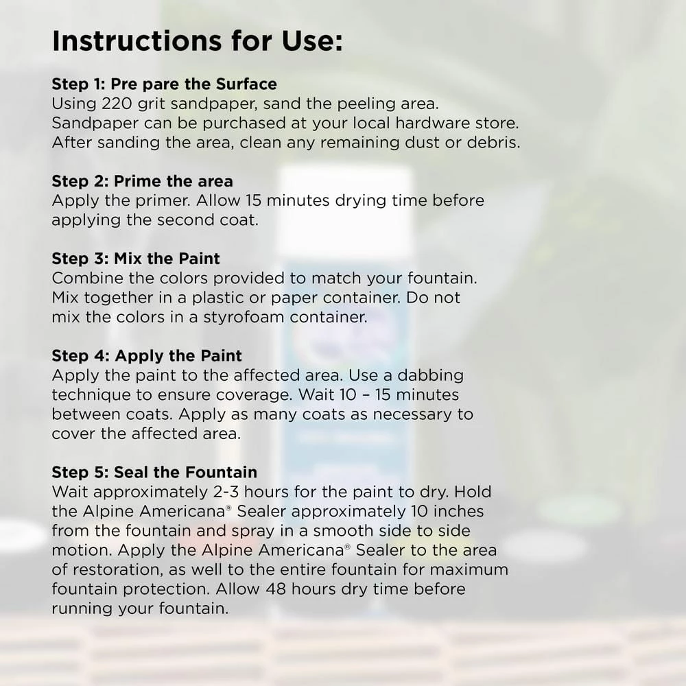 Keep your lawn decorations looking their best with the Americana Touch Up Paint and Sealer Kit for Water Fountains and Yard Statues from Alpine Corporation. This versatile restoration kit will allow you to touch up all of your Alpine Corporation yard statues, birdbaths and floor fountains to keep them looking like new. Including primer, thinner, seven vibrant paint colors, sealer, and a sponge brush, this touch up set has all that you need to bring your lawn decorations back to life and keep them looking their best year after year. These paints can also be used to customize your fountains and other lawn decorations to add customized flair to your outdoor area. The materials in this kit are easy to apply and feature a quick dry time for fast and convenient application.Alpine Corporation is one of America’s leading designers, importers, and distributors of superior quality home and garden decor products. Alpine’s award winning in-house design team continuously develops new and innovative “statements pieces” for your home and garden. Your outdoor living spaces will be the envy of the neighborhood with our wide assortment of fresh, fashionable and contemporary products, from beautifully crafted solar garden stakes featuring patented motion and fiber optic lighting technology to gorgeous glass and glow-in-the-dark birdbaths and feeders.