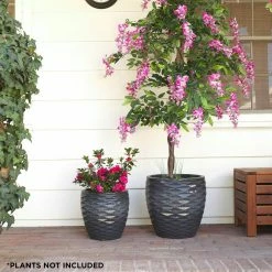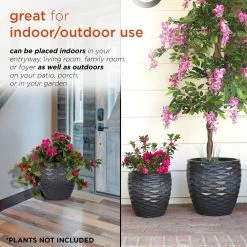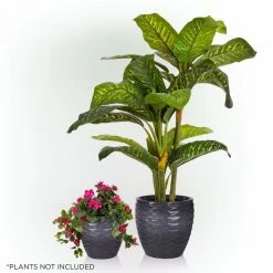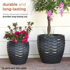 Enhance the natural beauty of your plants with the Alpine Corporation Etched Wave Vase Planters. This set of 2 coordinating planters feature a contemporary vase design with an embossed wave pattern in a speckled gray finish for a decorative way to display your plants and flowers. The integrated bottom holes allow you to plant directly into the planters while allowing for proper drainage after watering. These versatile planters can be placed indoors in your entryway, living room, family room or foyer as well as outdoors on your patio, porch or in your garden. Use separately in different locations or together to create a coordinated garden display. The durable polystone material is weather-resistant and rust-resistant for long-lasting use. The large planter measures 17 in. L x 17 in. W x 16 in. H and the small planter measures 13 in. L x 13 in. W x 13 in. H to fit in almost any indoor or outdoor area and they also include a 1-year manufacturer’s warranty from date of purchase.