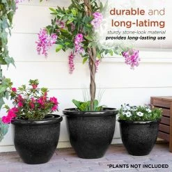 Enhance the natural beauty of your plants with the Alpine Corporation Planters. This set of 3 coordinating planters feature a classic design in a speckled black finish for a decorative way to display your plants and flowers. The integrated bottom holes allow you to plant directly into the planters while allowing for proper drainage after watering. These versatile planters can be placed indoors in your entryway, living room, family room or foyer as well as outdoors on your patio, porch or in your garden. Use separately in different locations or together to create a coordinated garden display. The durable polystone material is weather-resistant and rust-resistant for long-lasting use. The large planter measures 17 in. L x 17 in. W x 15 in. H, the medium planter measures 16 in. L x 16 in. W x 13 in. H and the small planter measures 14 in. L x 14 in. W x 12 in. H to fit in almost any indoor or outdoor area and they also include a 1-year manufacturer’s warranty from date of purchase.