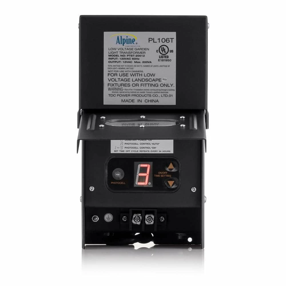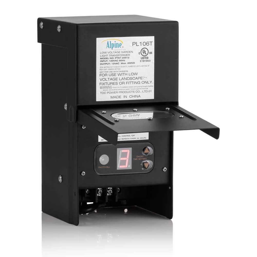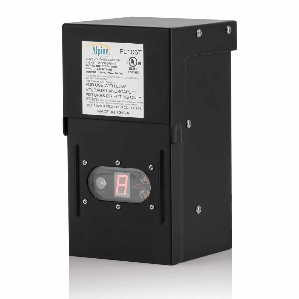 Enhance the beauty of your landscaping and outdoor scenery with the Alpine Corporation Outdoor 200-Watt Transformer with Photo Cell and Timer. This compact outdoor transformer makes it easy to light up your indoor or outdoor fountains or ponds with the convenient light-activated photocell and timer. Constructed of weather-resistant plastic, the transformer is made tough for outdoor use and works with any underwater or above water lighting that requires a transformer. For automatic activation, the transformer features a photocell that detects light and instantly activates once it gets dark. It also features a convenient timer that allows you to adjust the duration of the lighting in one-hour increments for continuous use. The 200-Watt compact transformer measures 9 in. L x 5 in. W x 5 in. H to fit discreetly in outdoor areas, and includes a 1-year manufacturer’s warranty from purchase date.Alpine Corporation is one of America’s leading designers, importers, and distributors of superior quality home and garden decor products. Alpine’s award winning in-house design team continuously develops new and innovative “statements pieces” for your home and garden. Your outdoor living spaces will be the envy of the neighborhood with our wide assortment of fresh, fashionable and contemporary products, from beautifully crafted solar garden stakes featuring patented motion and fiber optic lighting technology to gorgeous glass and glow-in-the-dark birdbaths and feeders.
