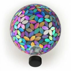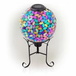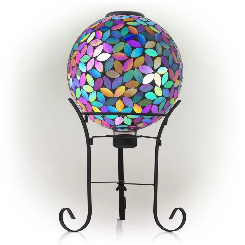 Add beautiful, bright color to your yard with Alpine’s Outdoor Solar Powered Glass Mosaic Gazing Globe with LED Lights and Metal Stand. Made from different colored pieces of glass, this spherical yard art Decor provides a unique and decorative addition to your home’s exterior Decor with its colorful, mosaic design. Featuring 10 solar powered LED lights, the solar energy keeps your outdoor gazing ball lit up throughout the night for a bright, colorful display. The multi-use glass gazing ball can be used in a variety of ways, including in your garden, patio, courtyard, or front door entryway. The glass orb comes with a durable metal stand made from weather-resistant iron to securely hold the garden sphere. Add one or multiple glass orbs to enhance your formal or informal garden’s natural beauty with their electrifying colors and iridescent shine. This colored glass gazing ball will add vibrant color and shine to your garden, and will help promote a healthy garden by reflecting light on sunny days. This colorful glass gazing sphere measures 10 in. L x 10 in. W x 17 in. H to fit almost any outdoor area and includes a 1-year manufacturer’s warranty from date of purchase.