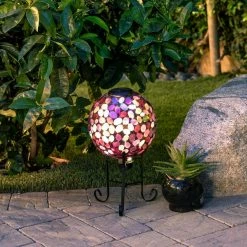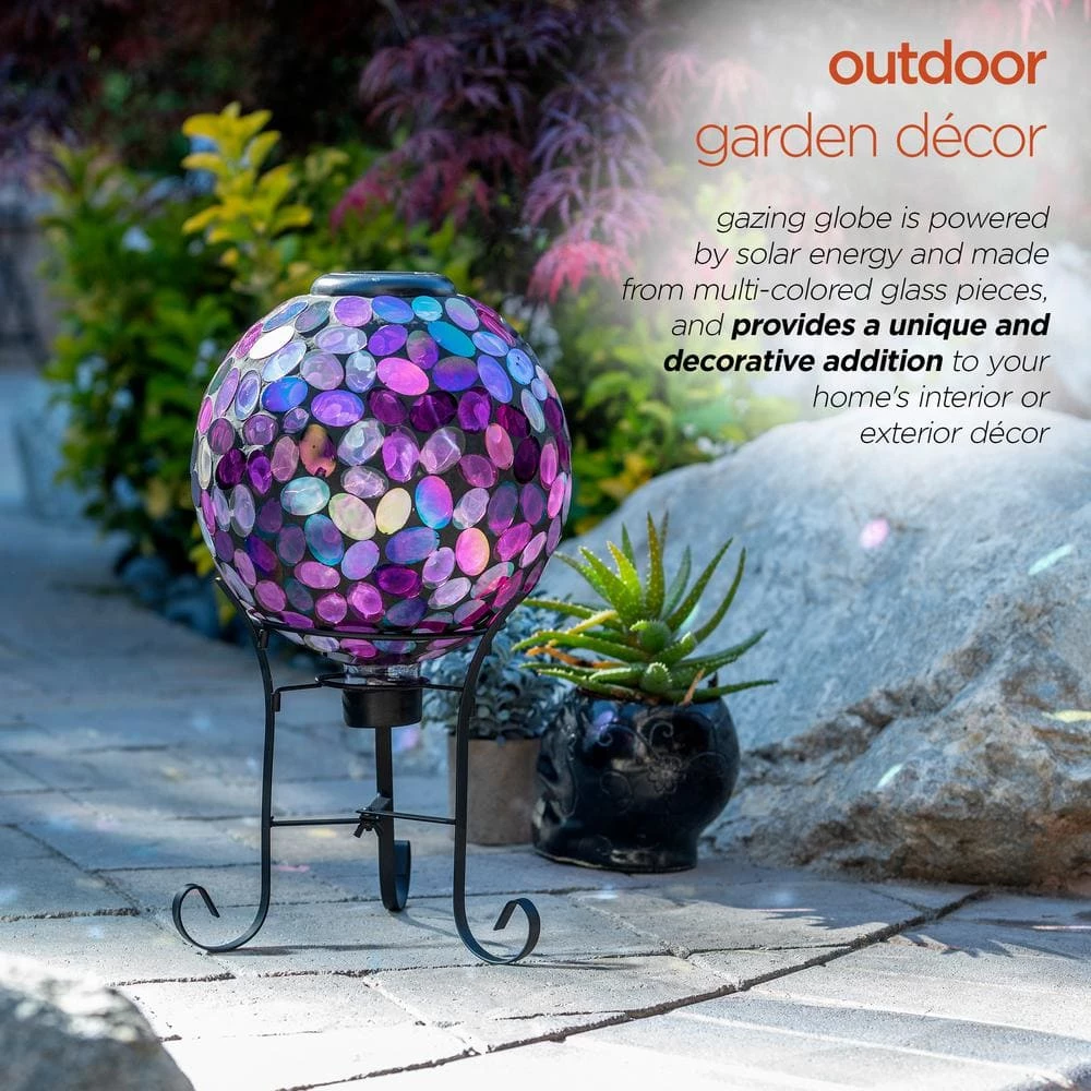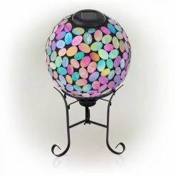 Add beautiful, bright color to your yard with Alpine Corporation’s Outdoor Solar Powered Glass Mosaic Gazing Globe with LED Lights and Metal Stand. Made from different colored pieces of glass, this spherical yard art Decor provides a unique and decorative addition to your home’s exterior Decor with its colorful, mosaic design. Featuring 10 solar powered LED lights, the solar energy keeps your outdoor gazing ball lit up throughout the night for a bright, colorful display. The multi-use glass gazing ball can be used in a variety of ways, including in your garden, patio, courtyard, or front door entryway. The glass orb comes with a durable metal stand made from weather-resistant iron to securely hold the garden sphere. Add one or multiple glass orbs to enhance your formal or informal garden’s natural beauty with their electrifying colors and iridescent shine. This colored glass gazing ball will add vibrant color and shine to your garden, and will help promote a healthy garden by reflecting light on sunny days that illuminates a delightful pattern on any flat or even surface. This colorful glass gazing sphere measures 10 in. L x 10 in. W x 11 in. H and with stand 17 in. H to fit almost any outdoor area and includes a 1-year manufacturer’s warranty from date of purchase.