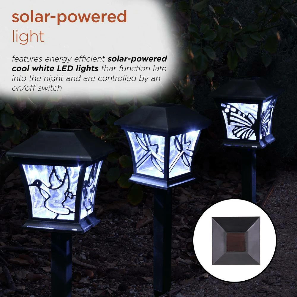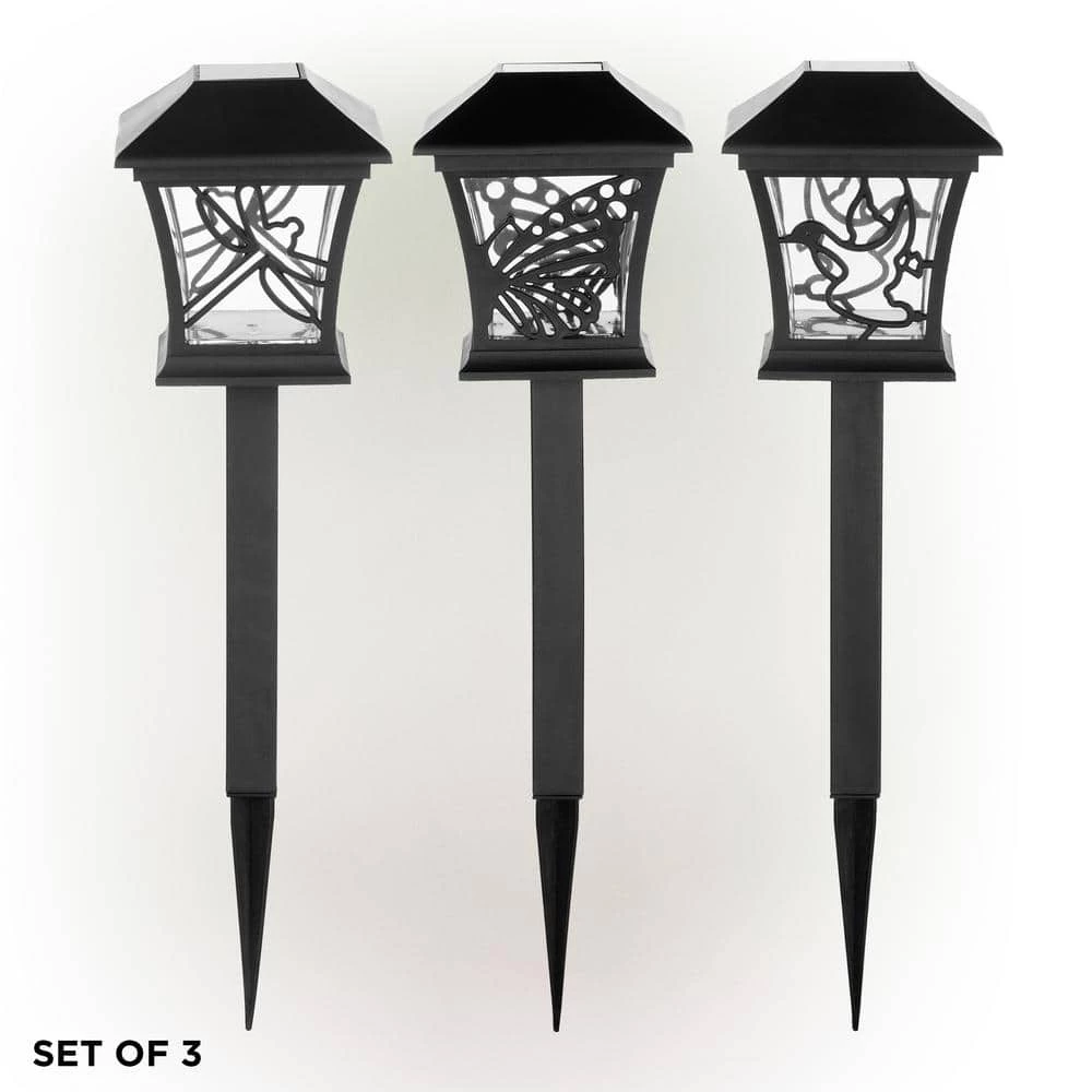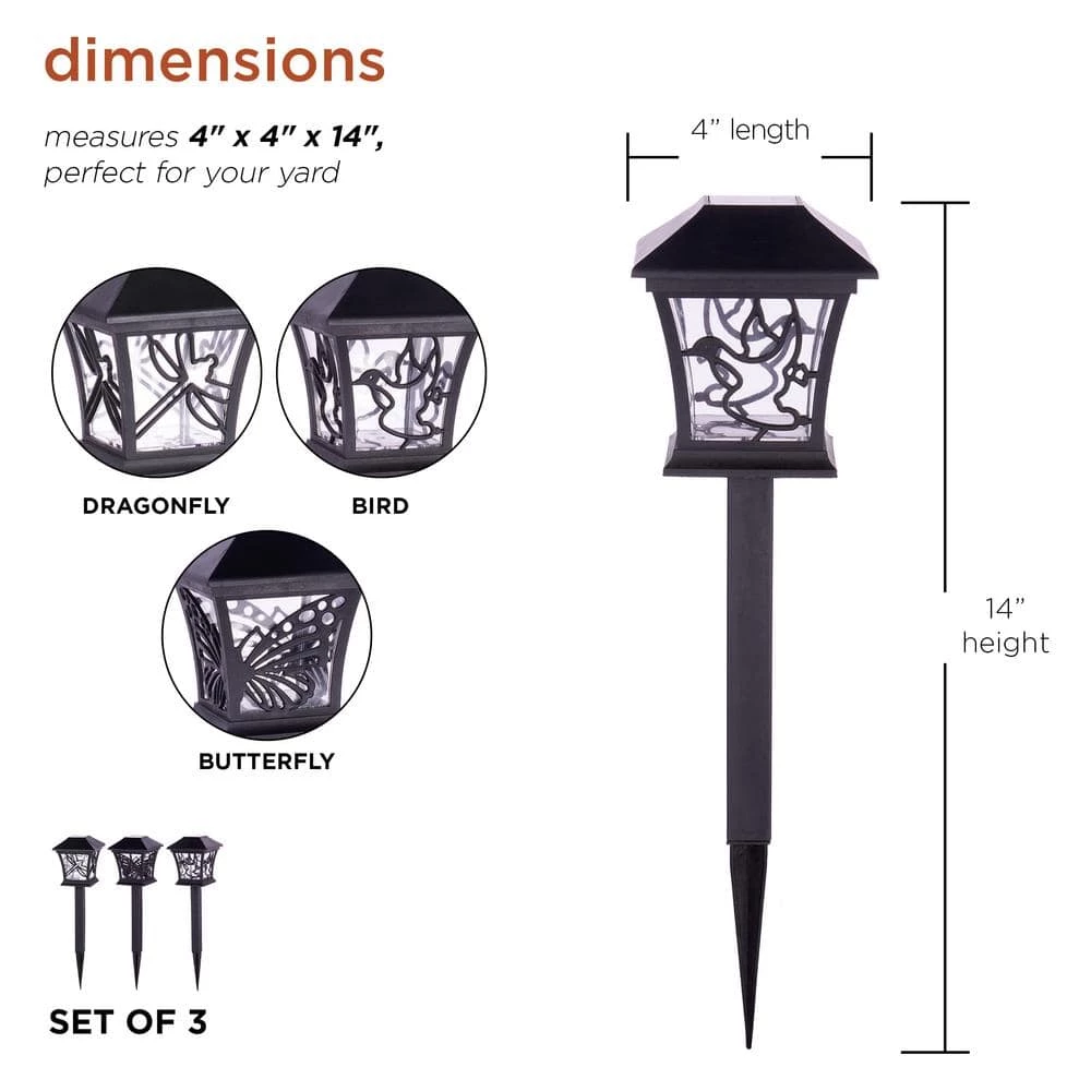 Cast a shining light on your yard with the Alpine Corporation Nature Inspired solar-powered Pathway Lights. This lovely 3-pack comes with a set of unique black garden stakes, each topped with a frosted pane box that displays a metal butterfly, dragonfly or bird accent. Apply these lights in your garden, by your porch, or along your pathway to add a chic touch to your lawn. Each box houses a solar-powered, cool white LED light that will illuminate your garden well into the nighttime. Place these stakes out in the sun, allow them to charge, then enjoy the soft glow of these energy-efficient lights that you can control with the included on/off switch. Easy to set up, you can install these lights around the outdoor area of your choosing by simply inserting them into the soil until they’re secure. Each stake is constructed of a durable plastic that is weather and rust-resistant so you can enjoy these decorative stakes for many years. The stakes measure 4 in. x 4 in. x 14 in. each, and include a 1-year manufacturer’s warranty from date of purchase. Alpine Corporation is one of America’s leading designers, importers, and distributors of superior quality home and garden decor products. Alpine’s award winning in-house design team continuously develops new and innovative statements pieces for your home and garden.