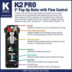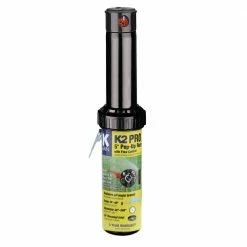 5 in. Pop-Up Pro Gear drive with patented easy arc setting. Adjust distance and flow control at the same time. Allows individual heads to be turned off during installation or adjustment – perfect for quick nozzle changes. K2 Pro comes with pre-installed 2.5 GPM nozzle. 4 low angle and 8 standard nozzles, adjustment key and instruction manual also included.