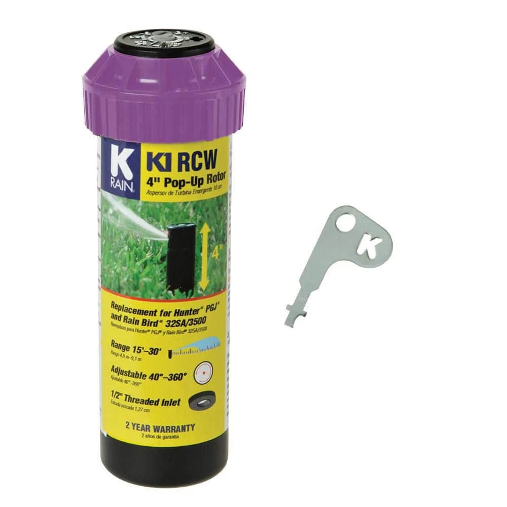 The K1 4 in. Pop-Up Gear Drive Sprinkler – RCW for Reclaimed/Non-potable water. The K-Rain K1 Gear Drive Rotor Sprinkler-RCW is a gear-driven sprinkler that delivers a quiet yet thorough performance. This powerful sprinkler features a 30 ft. maximum spray distance and can provide coverage for areas up to 2,827 sq. ft. for small to medium size lawns.