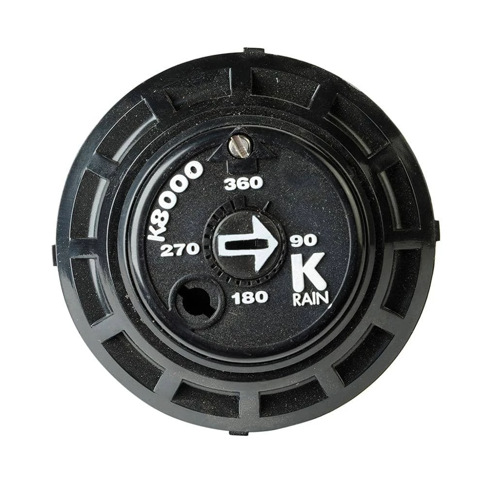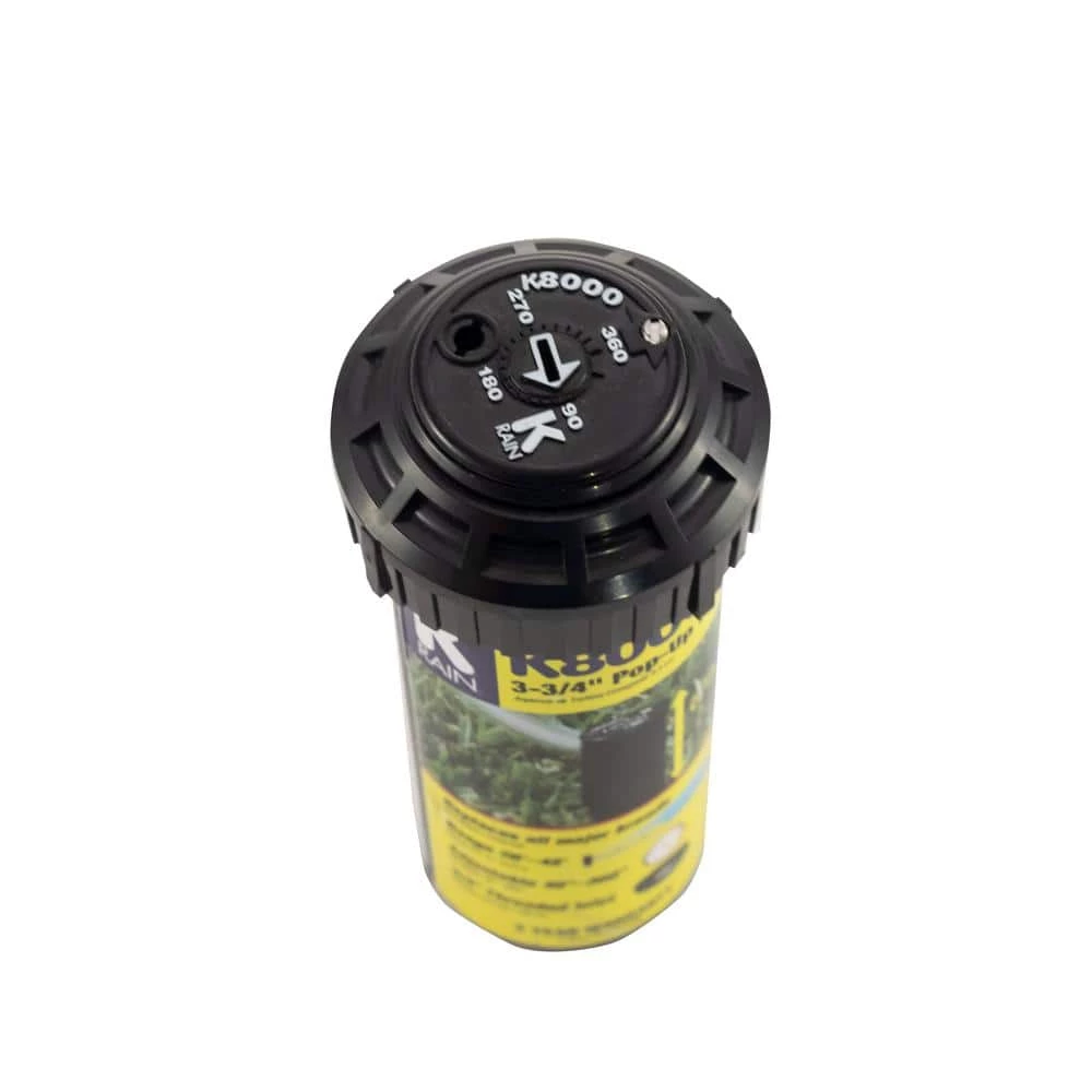 The K-Rain K8000 7,235 sq. ft. Professional Pop-Up Gear-Driven Sprinkler adjusts from 40ยฐ to 360ยฐ. It comes pre-installed with a 2.5 Gal. per minute single stream nozzle. The closed-case sprinkler will not clog with dirt and debris.